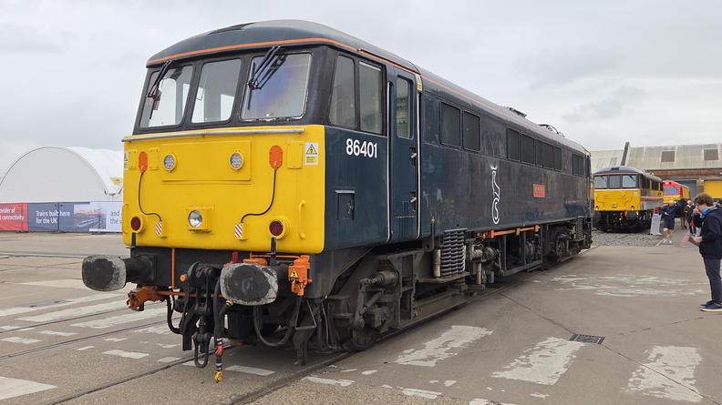 To the left: DB Cargo UK electric locomotive 92011; to the right: AC locomotive Group / Electric Traction Ltd electric locomotive 89001; at the Greatest Gathering at Alstom's Litchurch Lane works.