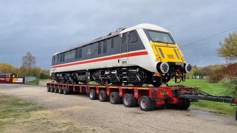 Towards the end of 2022, with most of the parts for the mainline safety systems in hand, but with the workshops at Barrow Hill at full capacity, the decision was taken to move the locomotive to the UK Rail Leasing works at Loughborough for the mainline equipment installation to take place. The move by road from was made from Barrow Hill to Loughborough on 24/11/2022 - with traction motors still missing from the locomotive a move by rail was not possible. A series of photographs shows the locomotive being loaded and moved at Barrow Hill by Allelys Heavy Haulage.