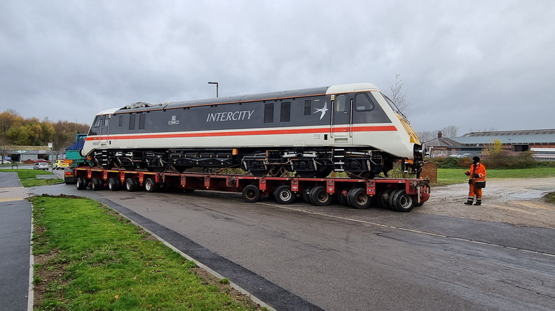 Towards the end of 2022, with most of the parts for the mainline safety systems in hand, but with the workshops at Barrow Hill at full capacity, the decision was taken to move the locomotive to the UK Rail Leasing works at Loughborough for the mainline equipment installation to take place. The move by road from was made from Barrow Hill to Loughborough on 24/11/2022 - with traction motors still missing from the locomotive a move by rail was not possible. A series of photographs shows the locomotive being loaded and moved at Barrow Hill by Allelys Heavy Haulage.