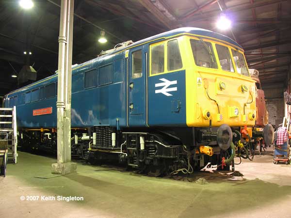 Pantograph, insulators and bus-bars on 86101 receiving attention.