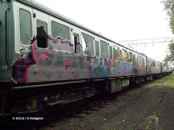 304021 in Crewe Carriage Sidings. What had been a pristine unit when preserved had, by now, been thoroughly wrecked by vandals.